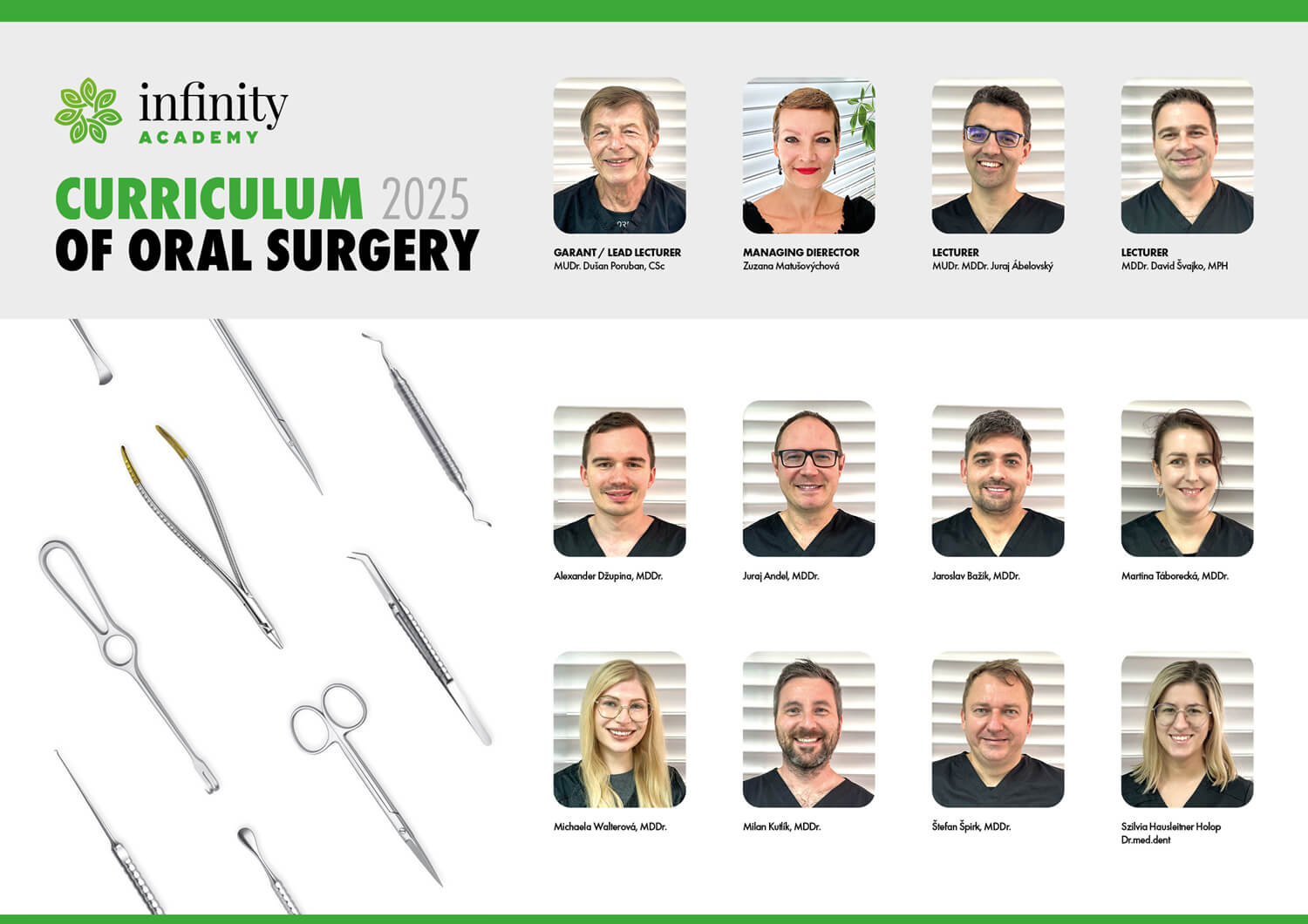 Vzdelávací cyklus Curriculum of Oral Surgery mal svoj prvý ročník v roku 2023 pod spoločnosťou Implant & Aesthetic Academy, s.r.o. Od roku 2024 prebieha toto ucelené vzdelávanie v zubnej chirurgii pod spoločnosťou INFINITY Academy, s.r.o. Osnovy, prednášatelia aj priestory sú nezmenené.